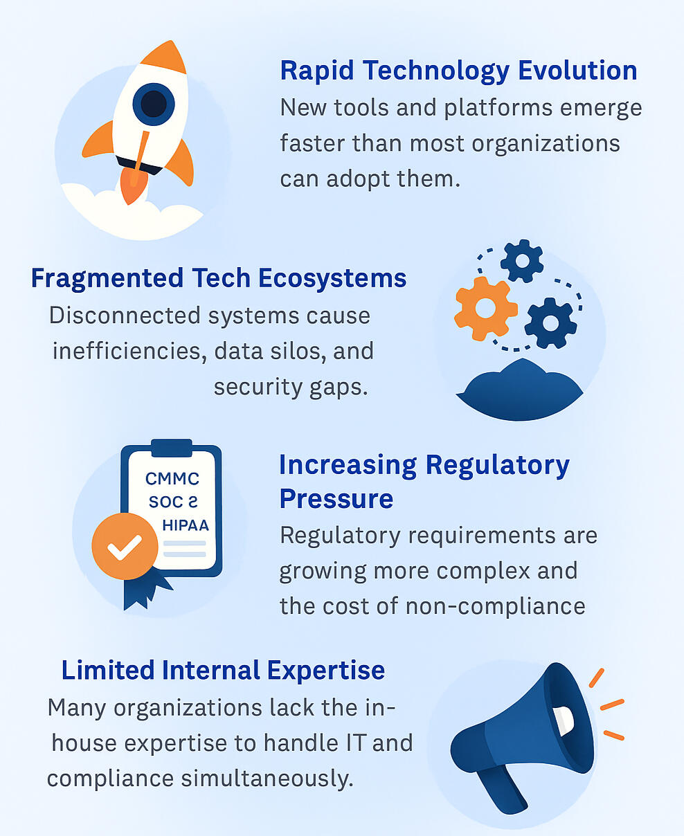 From CMMC to SOC 2, HIPAA, and NIST frameworks, regulatory requirements are growing more complex — and the cost of non-compliance is rising.Limited Internal Expertise